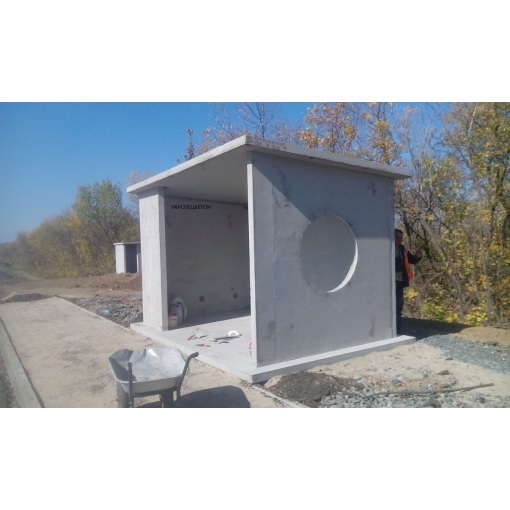 Автопавільйон залізобетонний складається з декількох елементів, які у зібраному стані мають розмір зупики 4400х2900х2500 мм, Вага автопавільйону для 5 людей 12,5 тон.